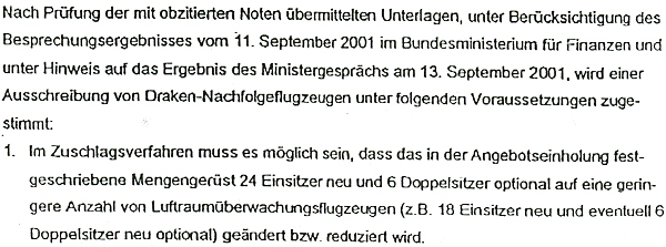 Startschuss im ParlamentAm 10. Juli 2001 dann eine neuerliche Sitzung des Landesverteidigungsrates.Bundesminister für Landesverteidigung Herbert Scheibner gibt einen Situationsbericht rund um die Draken-Nachfolge ab. Die Empfehlung der Kommission daraufhin lautet: "Vom Bericht des Bundesministeriums für Landesverteidigung wird Kenntnis genommen: Der Landesverteidigungsrat empfiehlt der Bundesregierung, insbesondere dem Bundesminister für Landesverteidigung, im Sinne der im Bericht dargestellten Vorgangsweise weiter zu verfahren. Der Bundesminister für Landesverteidigung möge ehestens verbindliche Angebote für die Nachfolge eines Luftraumüberwachungsflugzeuges einholen, sodass eine Entscheidung spätestens in der ersten Jahreshälfte 2002 getroffen werden kann. Dabei ist neben den technischen Aspekten auch auf ein effizientes Gesamtpaket aus Finanzierung und Kompensationsgeschäften wert zu legen sowie eine möglichst effiziente und kostengünstige Variante für die Pilotenaus- und -weiterbildung vorzusehen." Was folgt ist ein 66-tägiger Disput zwischen Finanz- und Verteidigungsministerium. Finanzminister Grasser verweigert die Unterschrift mit dem Hinweis, dass der Budgetsektion notwendige Unterlagen durch das Verteidigungsministerium nicht zur Verfügung gestellt werden. Das Verteidigungsministerium verweigert vorerst die Bereitstellung der Unterlagen mit dem Hinweis auf den sensitiven Inhalt der Verschlussakten. Am 20. Juli 2001 wid in einem Akt des Finanzministeriums vermerkt: "Bei einem Gipfelgespräch auf politischer Ebene beim Herrn Bundeskanzler einigte man sich auf 18 Stück plus eventuell sechs Schulflugzeuge".