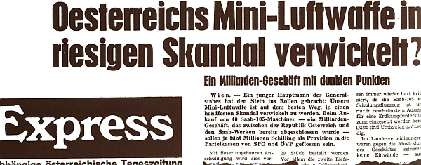 105 und "Saab 2 Mach"Die Regierung und Verteidigungsminister Prader favorisiert die schwedische Lösung. Eine Unterkommission der "Luftraumverteidigungskommission", die sogenannte "Jabo-Kommission" unter Brigadier Freihsler, tritt für den Ankauf einer Staffel Schulflugzeuge und zwei Staffeln Abfangjäger ein und spricht sich für den Ankauf von 20 Saab 105 aus, da man für die F-5 die Landepisten verlängern müsste.Bei der Sitzung der Luftraumverteidigungskommission am 18. Juli 1967 kommt man mehrheitlich überein, die Flugzeuge Saab 105XT und Saab 2 Mach (Draken oder Viggen) zur Beschaffung vorzuschlagen. Verteidigungsminister Prader hat zu diesem Zeitpunkt seine Entscheidung zugunsten Schwedens schon gefällt und kündigt am 19. Juli 1967 die umgehende Beschaffung von 20 Saab 105XT an, ohne das Kommando der Luftstreitkräfte und andere ministerielle Dienststellen in die Planung miteinzubeziehen. Schon am 20. Juli 1967 wird in einer Sitzung des Landesverteidigungsrate (LVR)s die vorgeschlagene Anschaffung von 20 Saab 105XT (im Paket ~öS 500 Millionen) angenommen. Der LVR stimmt gleichzeitig auch der Anschaffung von 12 Abfangjägern zu einem späteren Zeitpunkt zu.