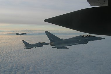Die beiden Eurofighter IPA3 (98-03) & GT003 (98-33) und eine Phantom F-4 der Wehrtechnischen Dienststelle/WTD 61 (38-13) gingen längsseits und begleiteten die Herkules den Rest des Weges nach Manching.