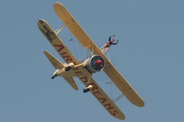 ![]() Lies US-Flugshow-Nostalgie aufkommen - das Wingwalker-Damenduo mit der Airmanbeans-Stearman. Foto: Martin Rosenkranz |